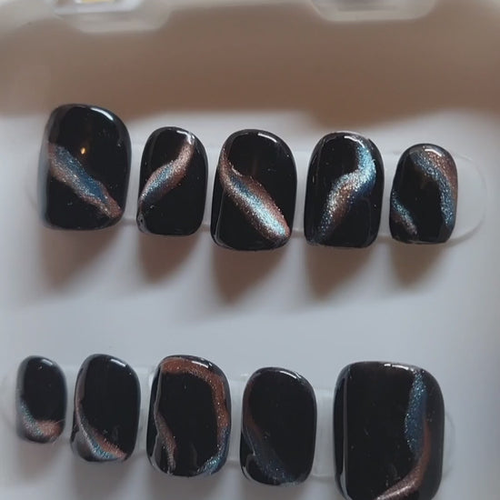 Black marble cat eye gel effect freestyle with glossy top coat short square press on nails- 10 pieces