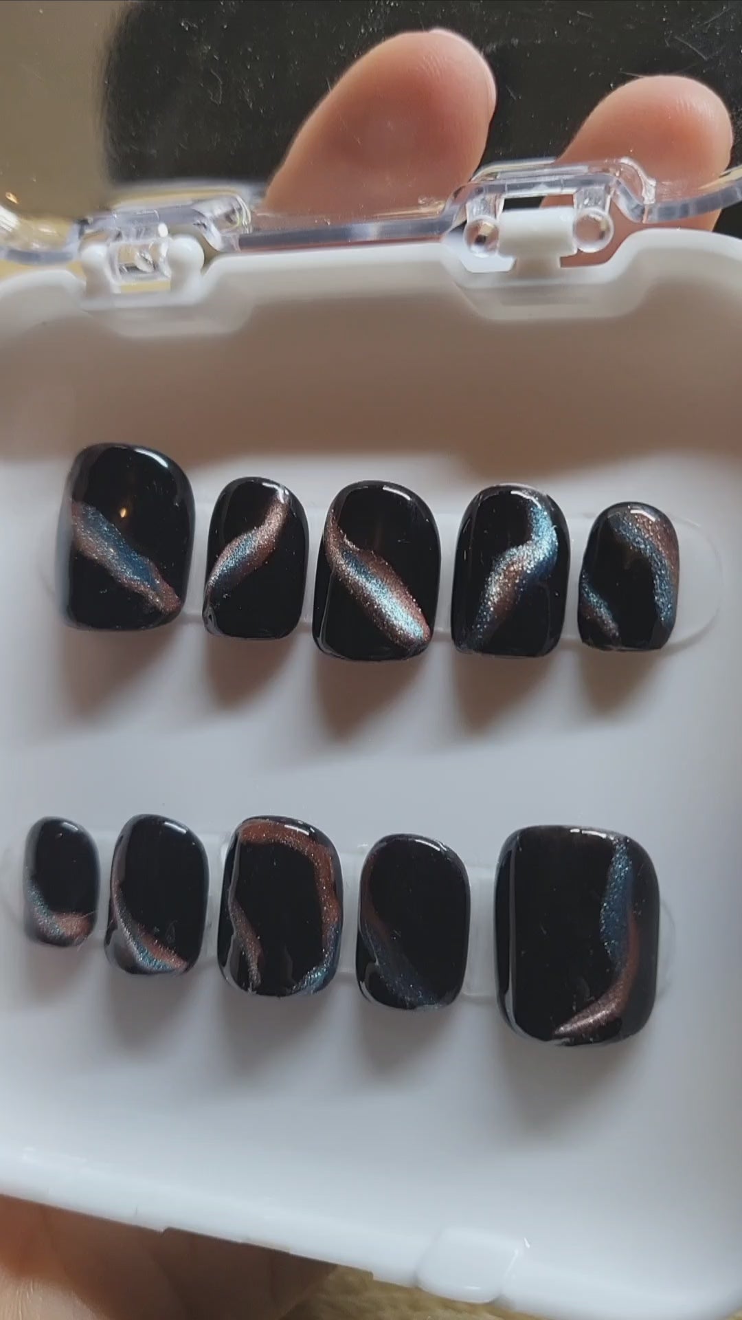 Obsessed with cat eye effect nail art ! This short square nail tips were inspired by marbles ! Black UV gel nail polish used as base colour ! After that I created freestyle nail art with cat eye gel with 2 different colours and with magnet I created the desired effect !! Reusable and durable!