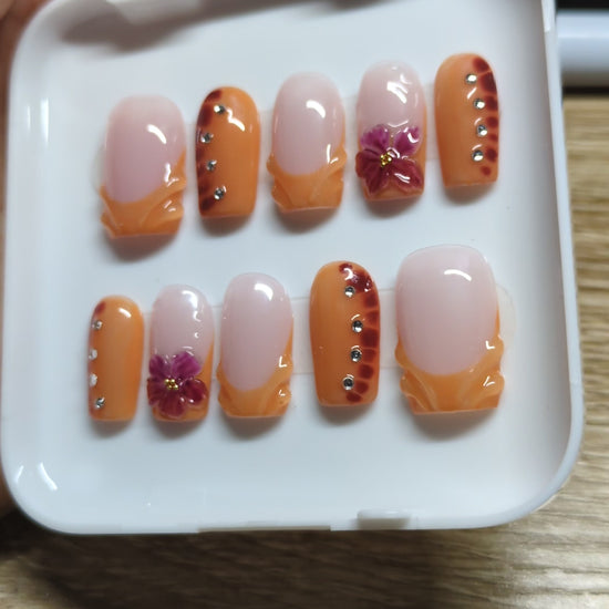 French style orange colour square press on nails with 3D nail art , 3D flowers, blooming nails and rhinestones