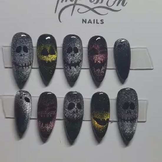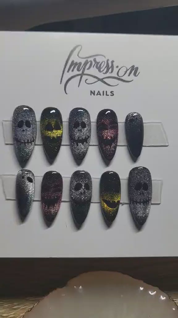 Halloween theme Inspired press on nails set with cat eye creepy faces spooky ghosts perfect for Halloween parties and events