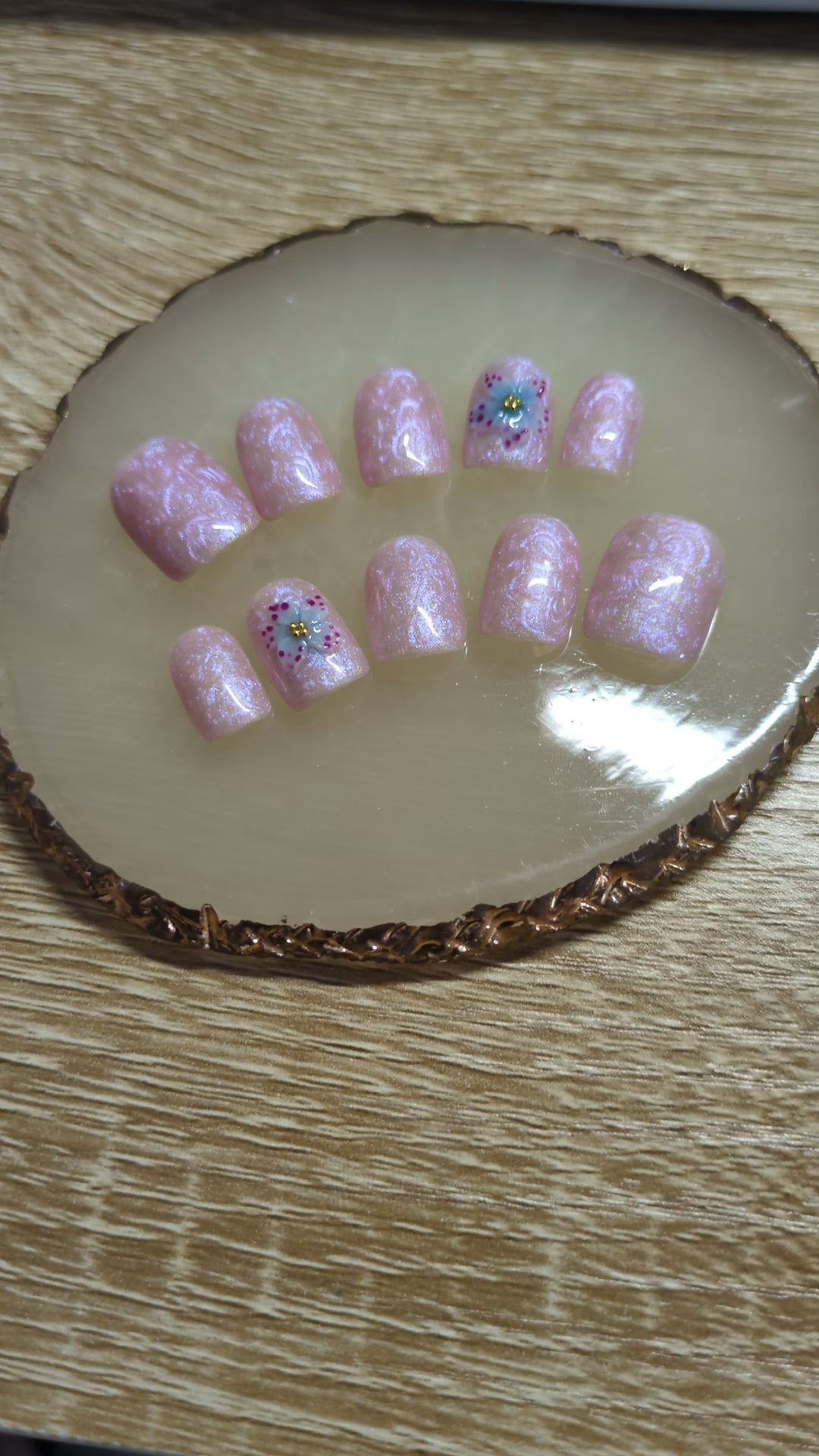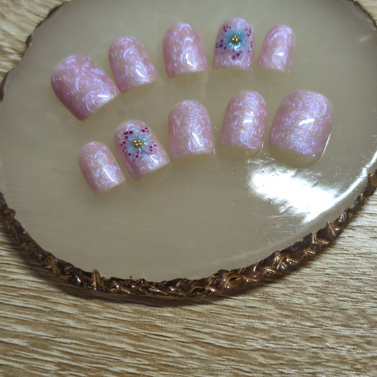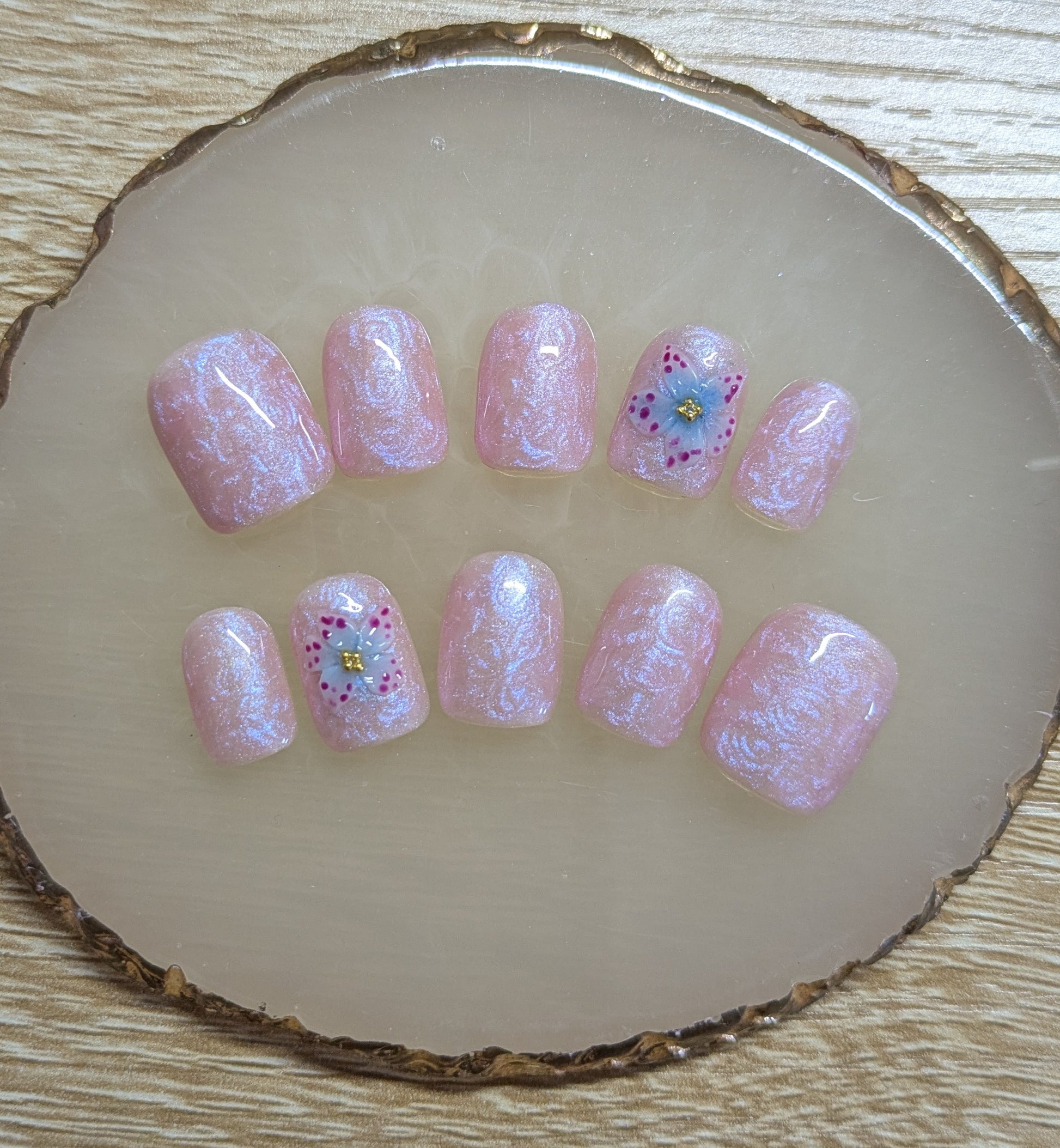 Pink with Blue shades pearly swirls with 3D exotic flower /short square soft gel tips/ summer nails/exotic / tropical nails/vacation nails - 10 pieces